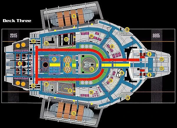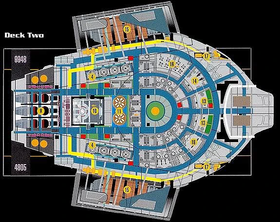 Engineering can be accessed from decks 1 and 2, with primary access on Deck 2. Secondary access to the Impulse Engine assembly is available from side exits on Deck 2. Engineering staff is typically limited to 10-15 at most, with the majority operating outside Engineering itself.