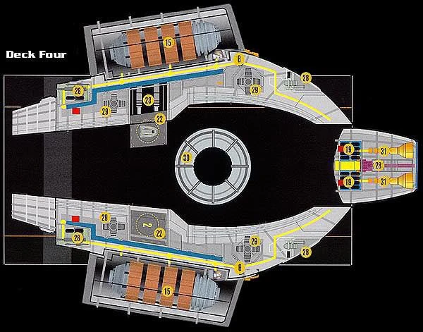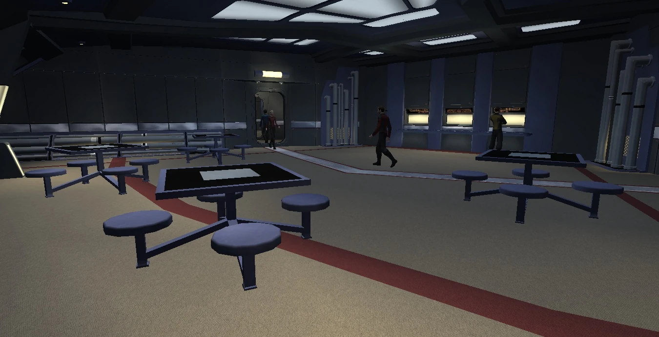 Due to limited resources, the Defiant-class is not equipped with multiple crew areas. As such, there are two dedicated crew rooms, which are composed of three to four tables, with replicators on one wall. The tables can be moved as needed, to allow the room to be used for exercise or large meetings. Each table has four built-in stools, allowing them to be moved as a single unit quickly, rather than taking time to set up. A viewscreen can be mounted on the wall for mission briefings or entertainment.